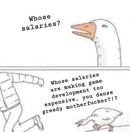 Today’s corporate shallowness seeks to eliminate the human element altogether to cut on time, expenses, and alongside it, anything and everything that slowly managed to convince all of us that games could be art back in the day. “We have to make games quicker” claims a nameless contingent of CEOs in a cycophantic GamesIndustry.biz article that went out the second the doors closed on the Gamescom business days and so didn’t have a second available to spend interrogating the claims made, such as the fact that “By far the biggest expense when making games is salaries”. As Michael Scally pointed out in response to the article on Bluesky: